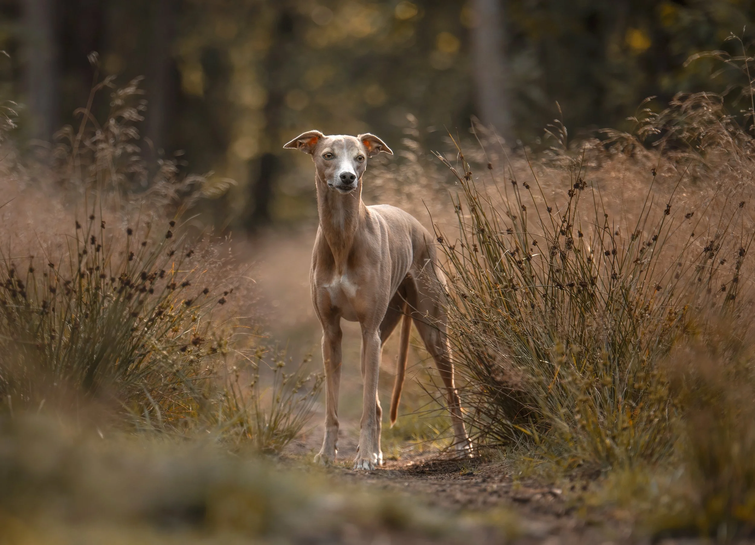 Een bruine whippet staat tussen het Friese hoge gras tijdens een fotoshoot van Hondenfotograaf Friesland.